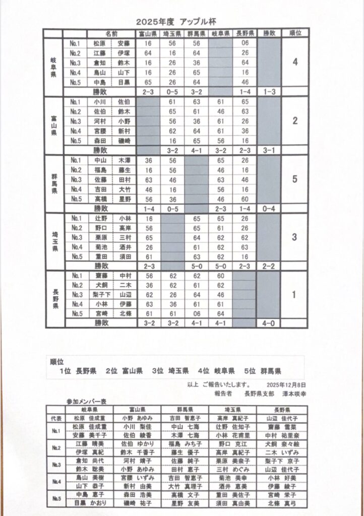 アップル杯開催! 2025 12/08 大会結果 やまびこドームにて5県による代表大会アップル杯が開催されました。長野県チームは¥が熱戦を制し優勝しました!!代表選手の皆様、運営の皆様、応援の皆様、1日お疲れ様でした。 大会結果 関連記事 ヨネックスレディースチャレンジカップ2025決勝大会 2025年12月10日 第47回全国レディーステニス大会終了しました 2025年12月5日 全国レディース長野県チーム、2006年以来19年ぶりベスト4進出! 2025年12月4日