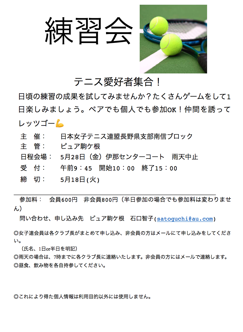 | 9月21日(木) | 練習会A秋 | 伊那市営テニスコート | 要項 |