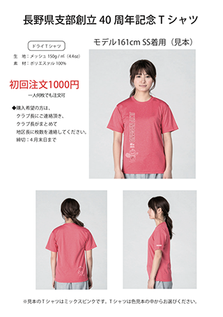 | 2023年3月23日 | 長野県支部創立40周年記念Tシャツ販売します!! ● 金額 初回 1,000円 ● カラー8色 ※購入希望枚数とサイズを各地区長さんがまとめてご連絡をお願いします。 ↓クリックしてください ![]() |